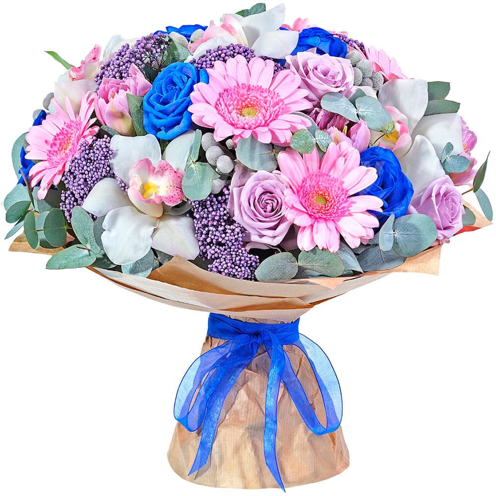 В этом букете яркие синие и сиреневые розы сочетаются с нежными розовыми герберами и белоснежными орхидеями, дополненные брунией, гипсофилой, озотамнусом и эвкалиптом. Композиция аккуратно завернута в крафт-бумагу и украшена яркой синей лентой, что придаёт ей свежий и утончённый вид. Она создаёт атмосферу радости и гармонии. Идеально подходит для романтического вечера для любимой женщины или для выражения благодарности учителю.