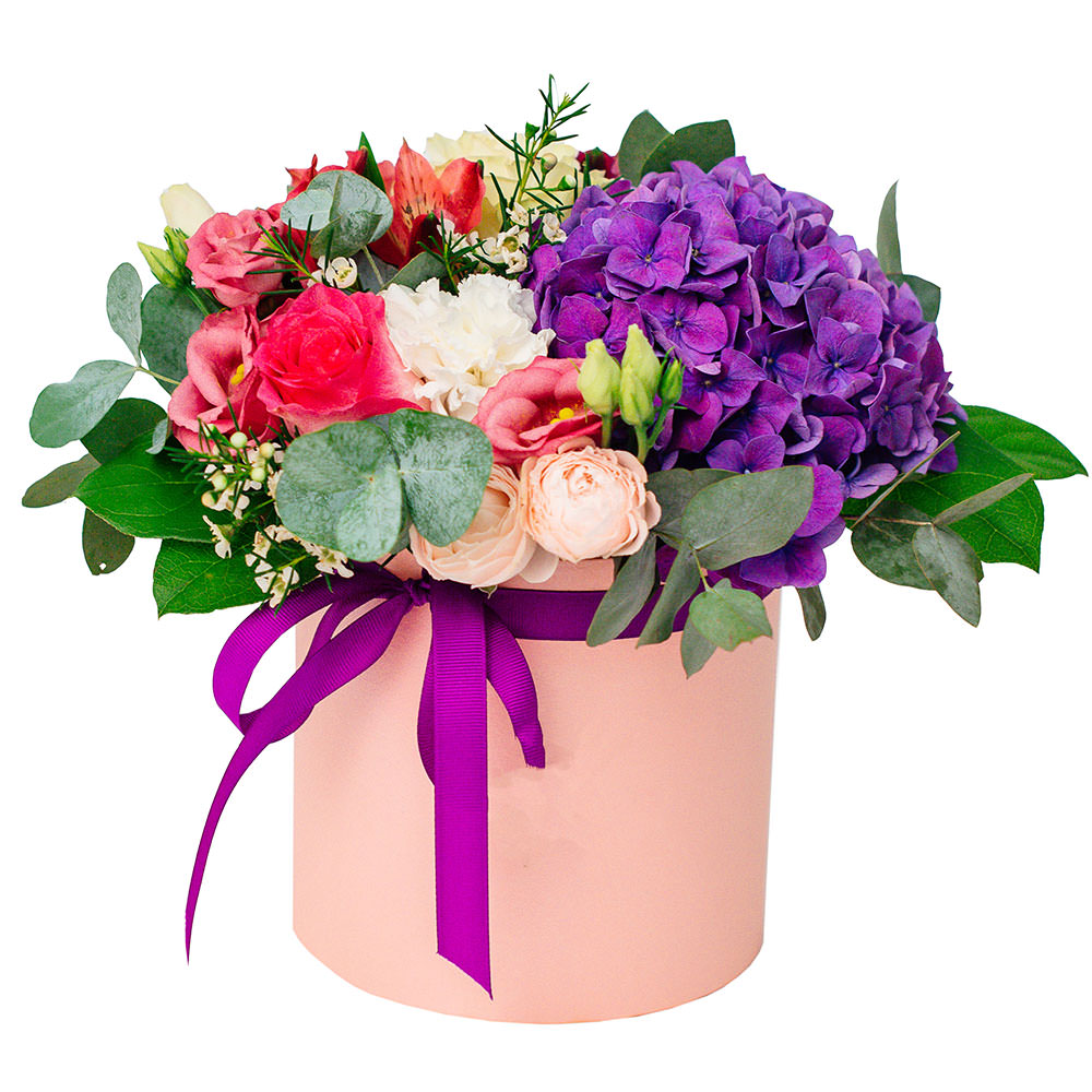 Эта композиция удивляет насыщенными оттенками фиолетовой гортензии и розовых роз. В букете также присутствуют кустовые пионовидные розы, розовая эустома, красная альстромерия и белая гвоздика. Всё это оформлено в элегантной шляпной коробке нежного розового цвета с фиолетовой лентой. Такой букет создаёт атмосферу утончённой элегантности и станет отличным подарком для подруги на юбилей.
