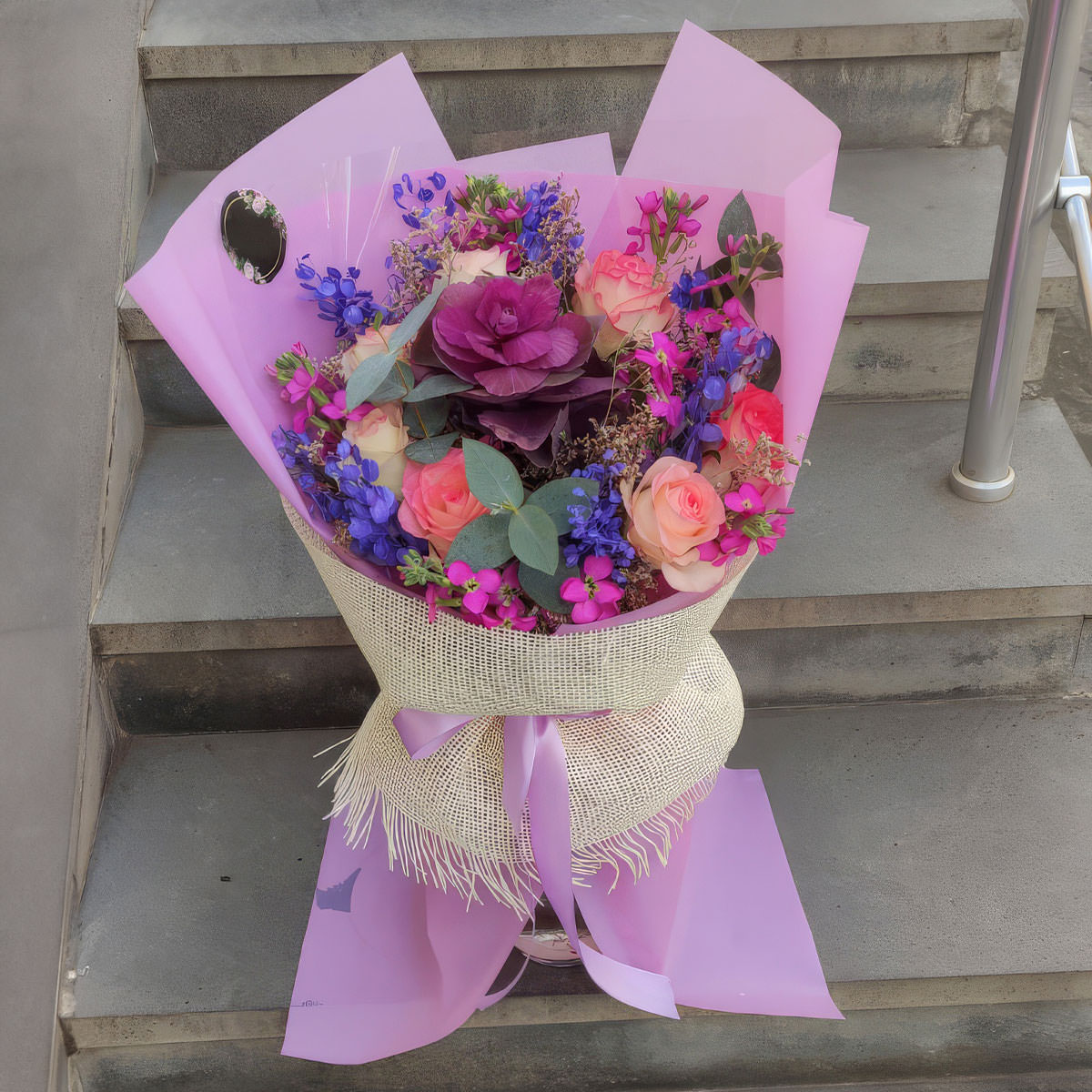 Этот букет завораживает своей яркой фиолетово-розовой гаммой. В его составе брассика, розовая одноголовая роза, сиреневая маттиола и синяя лунария. Упакован в нежную фиолетовую пленку и декоративную сетку, перевязанную атласной лентой. Такой букет создаёт атмосферу нежности и романтики, идеально подойдёт для встречи из поездки для любимого человека.