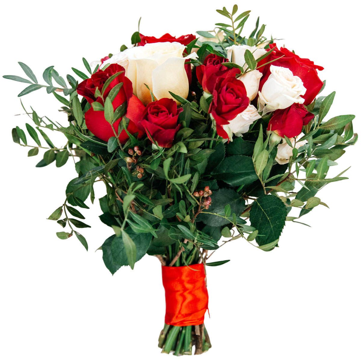 Роза одноголовая белая и красная, роза кустовая красная, фисташка. Упаковка (лента, пленка, крафт, сетка, пленка матовая)