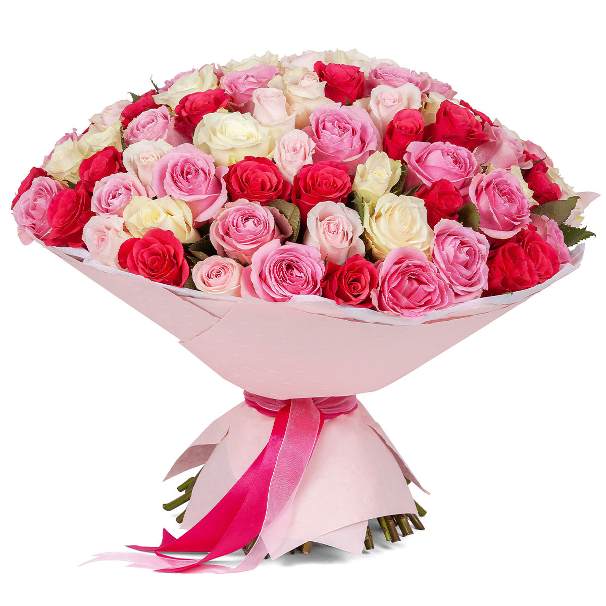 Лёгкость и нежность розовых и белых тонов создают атмосферу элегантности. В составе букета — белые и розовые одноголовые розы. Букет оформлен в матовую плёнку и перевязан яркой розовой лентой, придающей композиции завершённый вид. Подойдёт для поздравления на День учителя для классного руководителя.