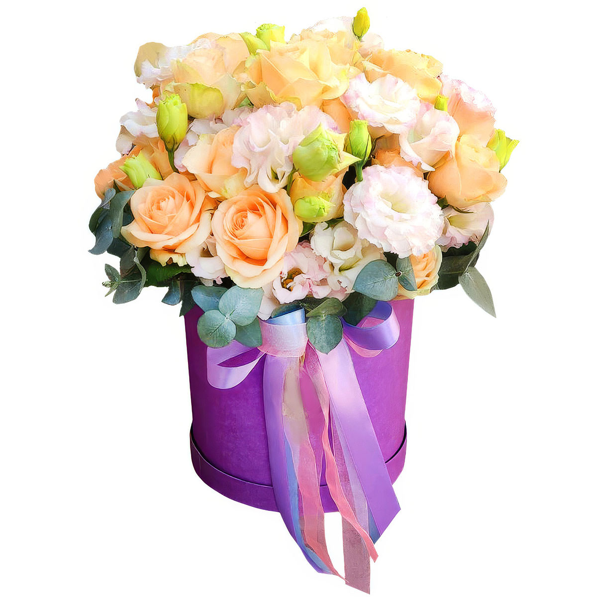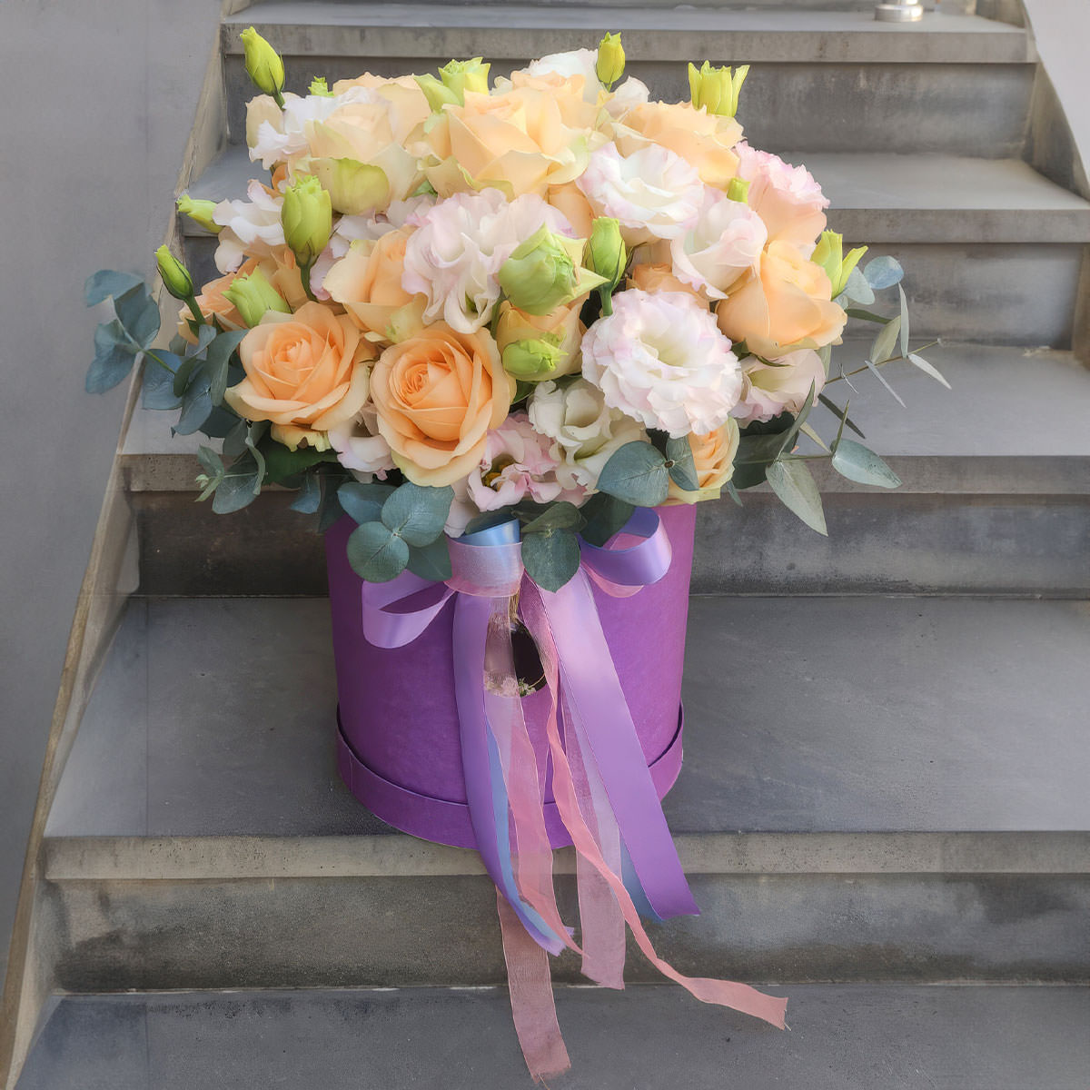 Эта композиция из нежных персиковых и светло-розовых оттенков создаёт атмосферу весеннего пробуждения. В составе букета — кустовая пионовидная роза и эустома, дополненные зеленью. Упакован в фиолетовую шляпную коробку с изящной лентой пастельных тонов. Такой букет станет отличным подарком для жены на День семьи, любви и верности, создавая теплое и романтическое настроение.