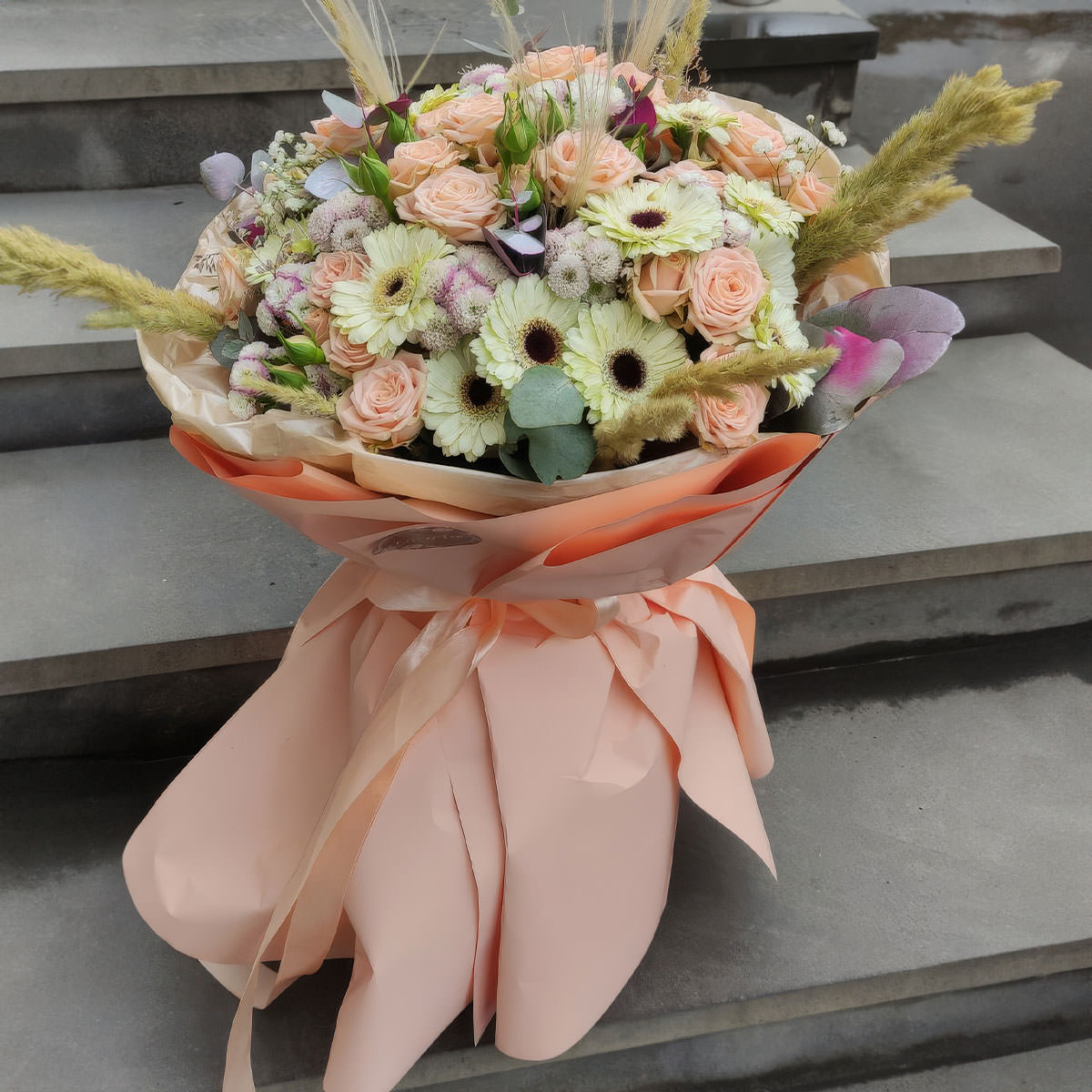 Этот букет дарит ощущение нежности и тепла благодаря кремовой палитре. В составе — гербера, кремовая кустовая роза, мини-хризантема, лагурус и эвкалипт. Упакован в матовую плёнку нежного персикового цвета с аккуратной лентой. Композиция создает атмосферу весеннего обновления и радости. Идеально подходит для поздравления учительницы на День знаний.