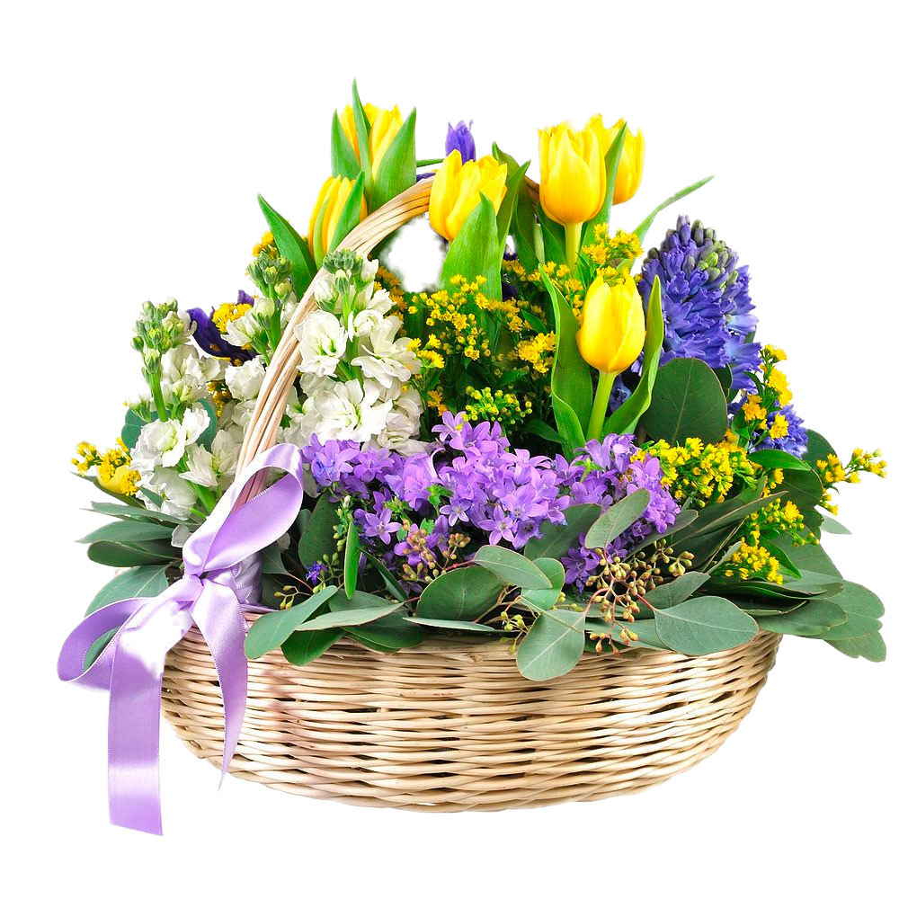 Яркая и солнечная композиция в жёлто-фиолетовых тонах. В составе: кампанула, жёлтые тюльпаны, синие гиацинты, белая маттиола, солидаго, ирисы и эвкалипт. Всё это размещено в плетёной корзине с изящной фиолетовой лентой. Этот букет создаёт атмосферу радости и свежести, идеально подойдёт для подарка на выпускной вечер для внучки.