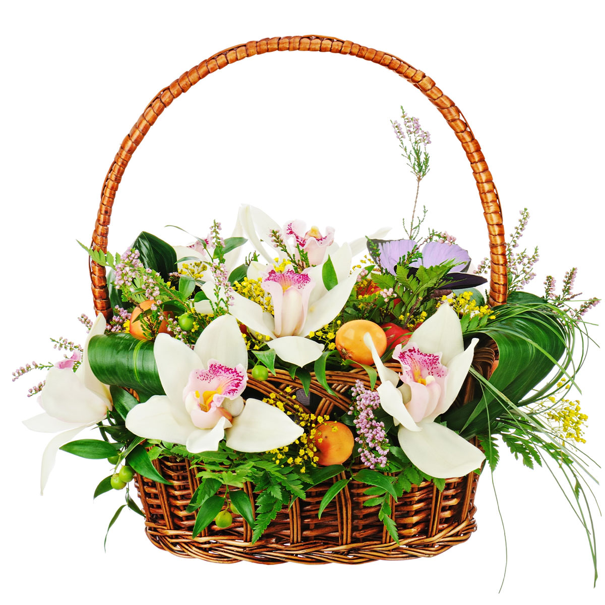 Элегантная композиция в бело-зелёной гамме создаёт атмосферу изысканности и свежести. В составе корзины белые орхидеи, аспидистра, гиперикум и зелень. Корзина из лозы с ручкой добавляет естественности и стиля, оформлена с помощью оазиса для долговечности. Идеально подойдёт для поздравления подруги на День Святого Валентина.
