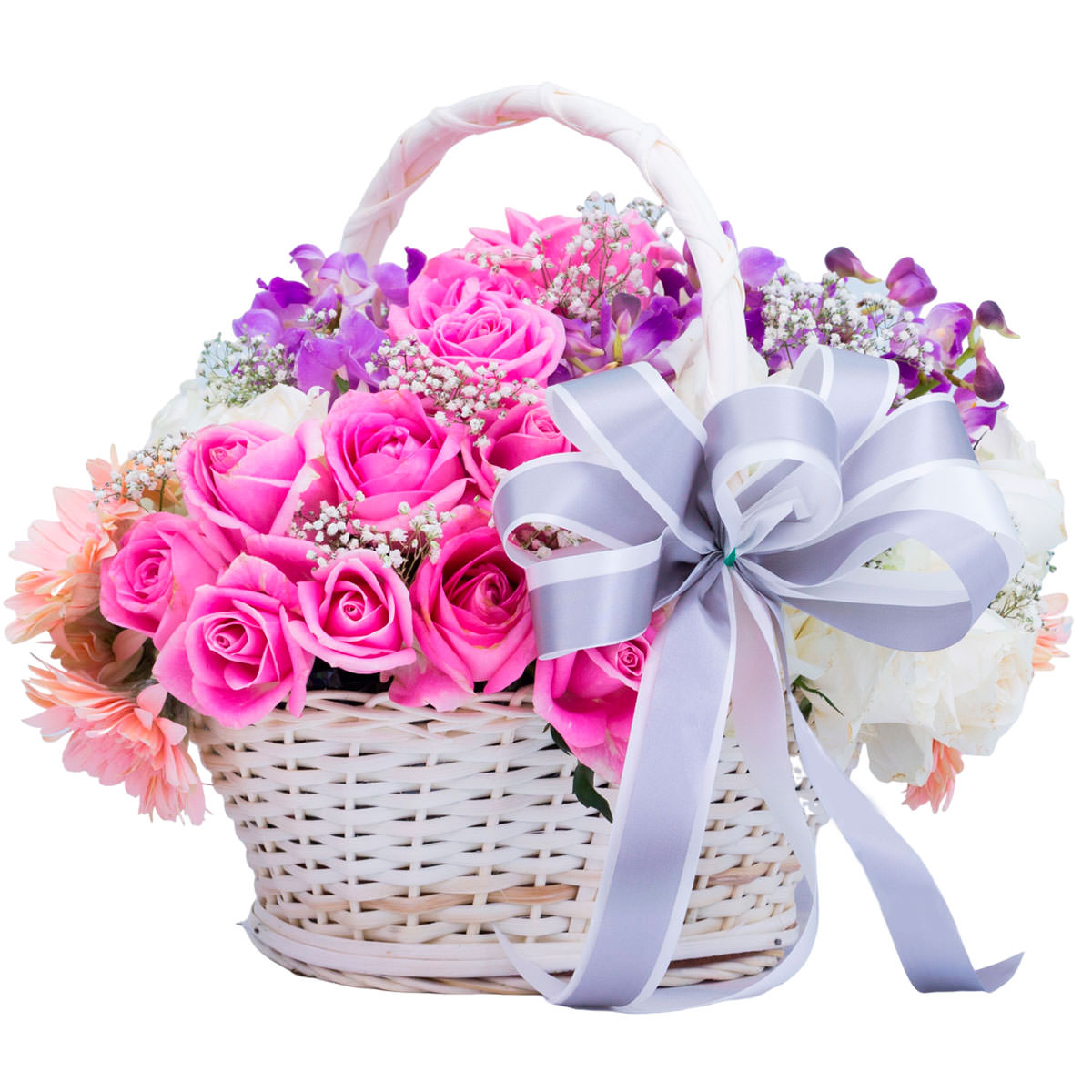 Эта яркая композиция из розовых и белых роз, сиреневых орхидей, персиковых гербер и гипсофилы создаёт атмосферу нежности и элегантности. Плетёная корзина украшена изящной лентой, придающей изделию особый шарм. Композиция прекрасно подойдёт для украшения свадебного торжества или подарка для любимой женщины. Идеальный выбор для создания романтического настроения.