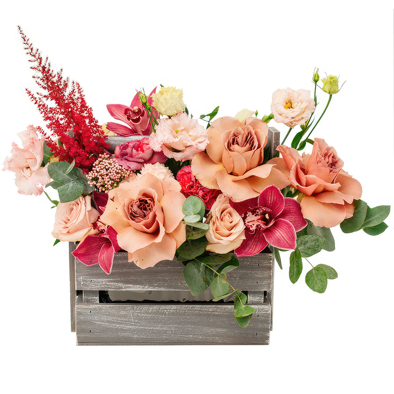 Эта цветочная композиция поражает нежностью розовых и кремовых оттенков. В составе роза одноголовая розовая, орхидея розовая, красная гвоздика, кремовая эустома и эвкалипт. Цветы размещены в стильном деревянном ящике, который подчёркивает естественную красоту букета. Создаёт атмосферу изысканности и гармонии, идеально подойдёт для поздравления начальника отдела на юбилей.