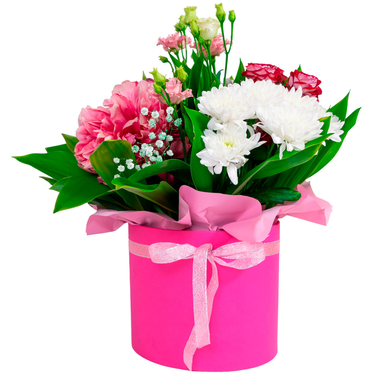 Нежная палитра розовых и белых оттенков создает атмосферу утренней свежести. В составе букета: белая кустовая хризантема, розовый пион, розовая кустовая роза, белая эустома и гипсофила. Композиция оформлена в ярко-розовой шляпной коробке с лентой, добавляющей изысканности. Это идеальный подарок для девушки на выпускной вечер, который оставит приятные воспоминания.