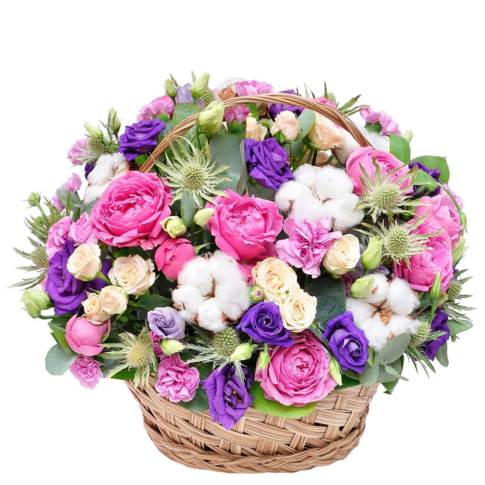 Эта композиция из розовых и фиолетовых оттенков создаёт атмосферу нежности и романтики. В состав входят розовая пионовидная роза, розовая кустовая гвоздика, кремовая кустовая роза, фиолетовая эустома, хлопок, эрингиум и эвкалипт. Все цветы аккуратно расположены в плетёной корзине. Идеально подходит для подарка на новоселье, особенно для любимой женщины.